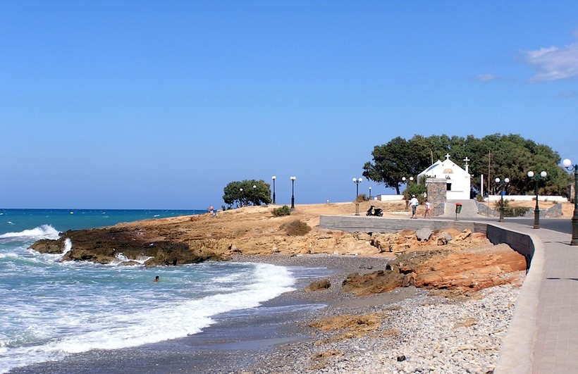 - Аммудара. Небольшой поселок в 4 км от Ираклиона на запад. В селении есть и все, что нужно требовательному туристу – прокат машин, аптека, магазины с сувенирами. Можно сразу забронировать апартаменты здесь, в поселке расположено несколько отелей. Есть и минусы у этого места – рядом расположена электростанция, но на мой взгляд, это не самый существенный недостаток. Меня больше напрягали летающие над головами самолеты, хотя аэропорт находится в 10 км отсюда. Сам пляж очень чистый, но к вечеру поднимались сильные волны, которые мешали плавать. В одном из кафе мы пробовали восхитительную рыбу на гриле с гарниром из картошки по-деревенски за 12 EUR.