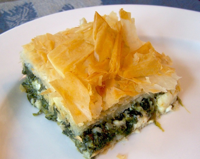 - Спанакопита – соленый пирог из теста фило и начинки из шпината с творогом. На несколько слоев теста выкладывают начинку, и выпекают в духовке. Получается очень вкусно!