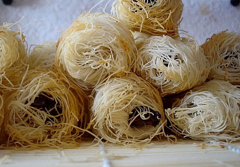 - Катаифи – сладость типа пирожных. Выглядит как клубок ниток с орешками и медом внутри. Для него используют специальное тесто катаиф в виде волокон.