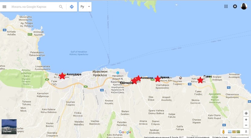 - Арена. Находится в том же направлении, что и предыдущие пляжи, только в 15 км от Ираклиона. Ориентиром служит поселок Ватьянос Кампос. Вход на пляж как и везде бесплатный, платить нужно только за зонтики и лежаки, хотя мы, как всегда расположились на покупных циновках. Здесь многоводных развлечений, поэтому пляж популярен среди молодежи. Пляжные бары и кафе тоже помогают скрасить отдых. Примерная стоимость обеда – 18 EUR на двоих. Очень вкусен здесь свежий апельсиновый сок за 2 EUR.