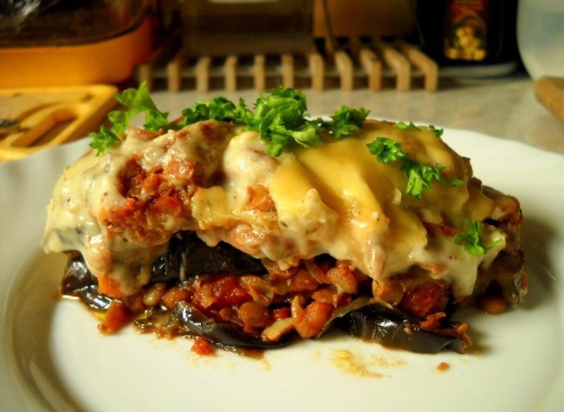 - Мусака – блюдо в виде запеченных овощей с фаршем. Ингредиенты укладываются слоями в глубокий противень и сверху поливаются соусом бешамель.