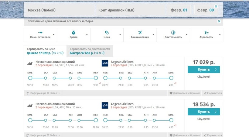 Провела небольшой эксперимент: сначала при поиске билетов для одного человека на рейс Москва — Ираклион указала дату начала февраля. Первым в поиске указан всегда самый выгодный вариант и по стоимости, и по времени в пути. Цена — 17 000 RUB пока без страховки и багажа, в среднем к ней еще прибавляется 1–2 000, это зависит от компании перевозчика.