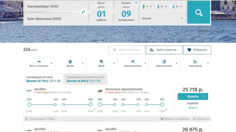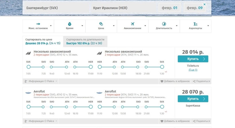 Если на эти же даты забронировать билеты Екатеринбург — Ираклион, то стоимость увеличится до 25 000–28 000 RUB.