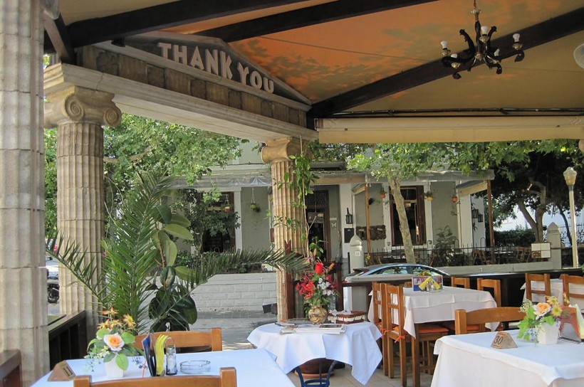 На него я набрел случайно. Он отличается стильным оформлением, а еще летом 2014 года там работали две русские официантки, Ирина и Галина, которые как могли развлекали своих соотечественников, вплоть до уроков национальных танцев сиртаки прямо между столами. Цены на горячие блюда там повыше, а вот поллитровый графин домашнего сухого вина стоит всего 5 евро.