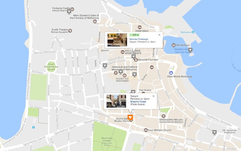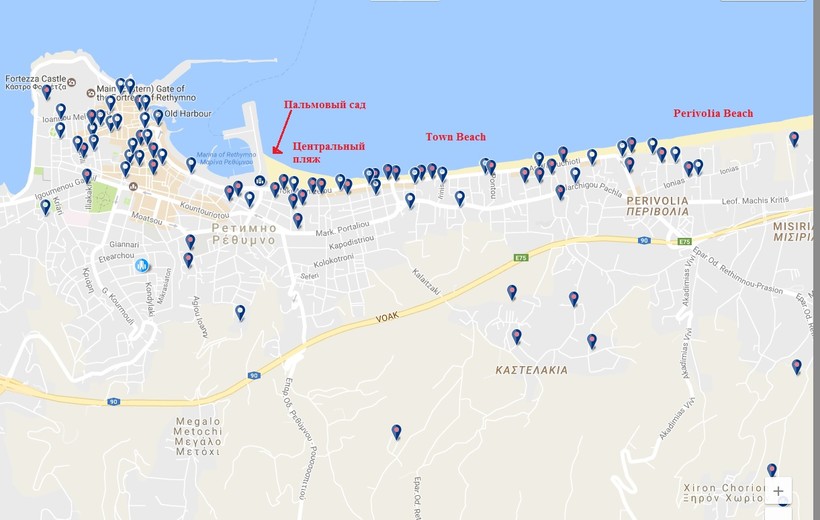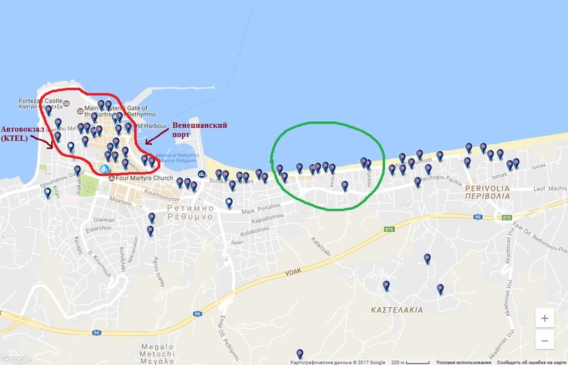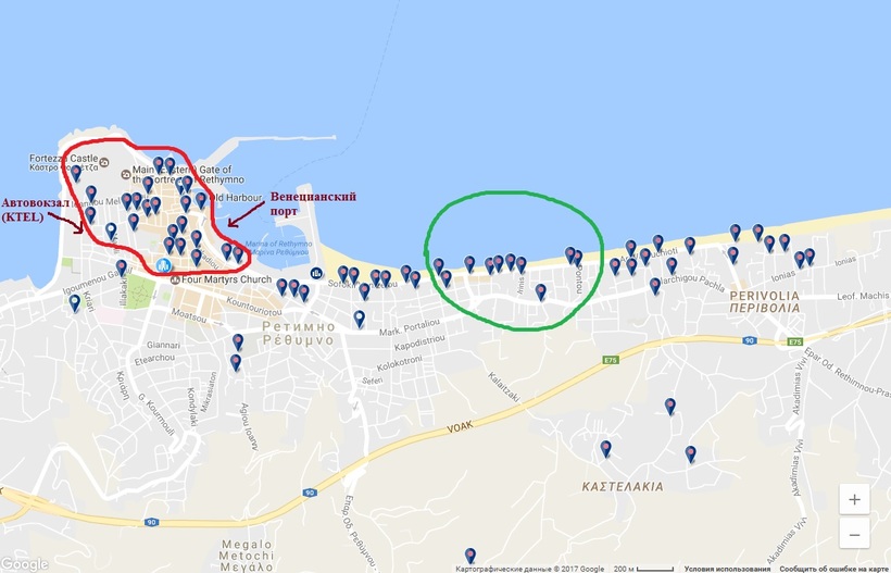 Зеленым цветом на карте обведены отели города Ретимно, которые отличаются оптимальным соотношением цены и расположения: находясь всего в 20 минутах ходьбы от главной улицы города, они предоставляют более низкие цены на проживание, чем отели в центре. Забронировать номер можно на Букинге, а цены сравнивайте здесь. Более подробно о стоимости проживания я расскажу дальше.