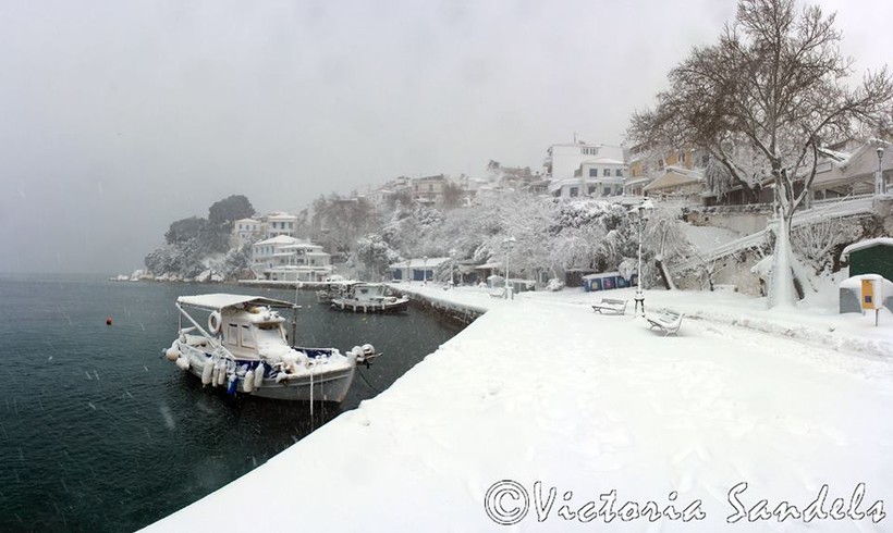 Аномально снежная зима 2017 года. Вид на порт. Автор фотографии — Виктория Санделс — замечательная личность и отличный экскурсовод. Она может вести экскурсии по Скиатосу на четырех языках: на греческом, английском, шведском и итальянском.