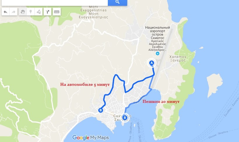 По сути, аэропорт находится в городе. На карте точки «B» обозначают начало и конец центральной улицы Пападиаманти. Но вряд ли вам нужно сразу сюда. В самом городе очень мало отелей, так как большая их часть расположена дальше по побережью, но об этом чуть позже.