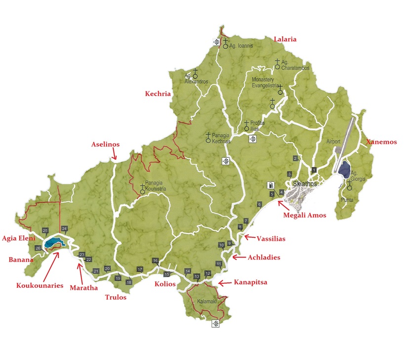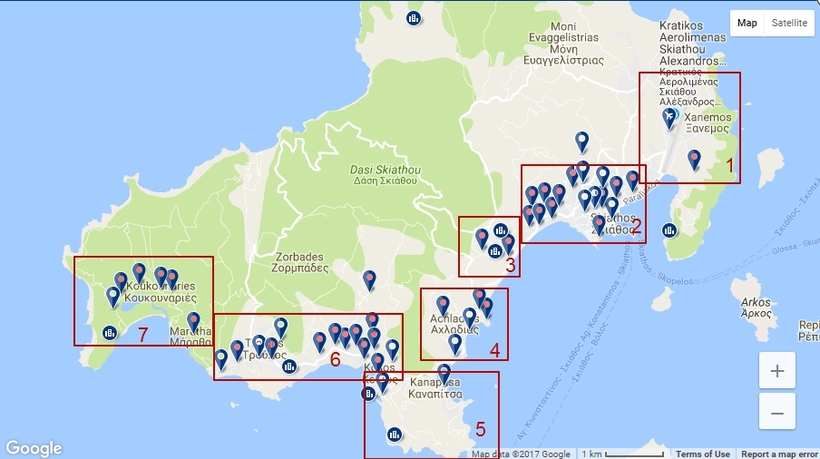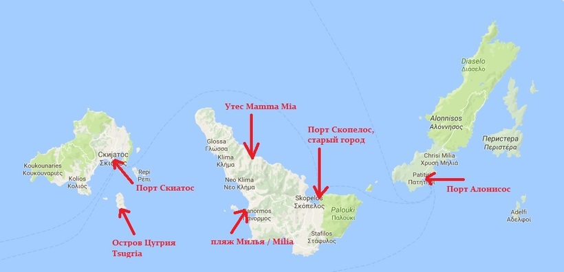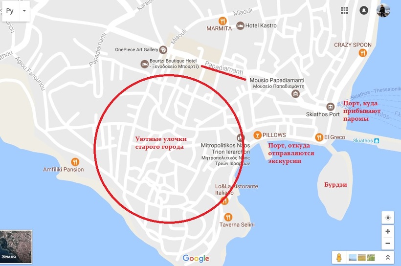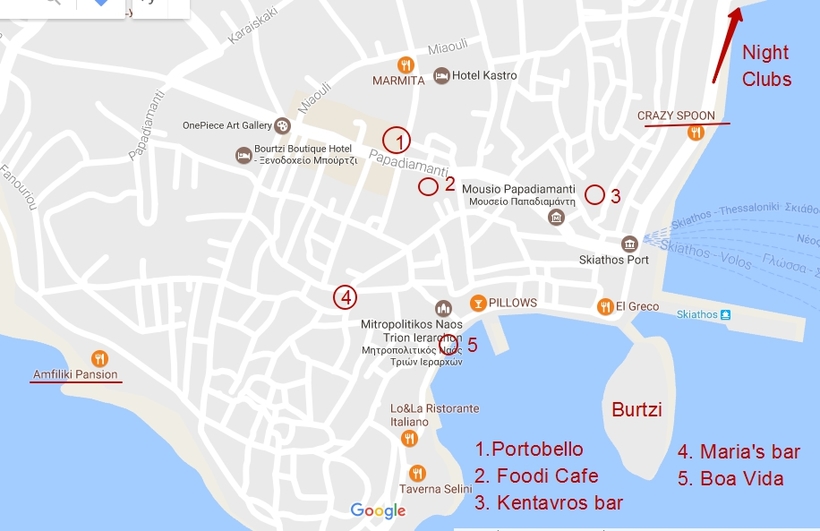 На Скиатосе очень сложно указывать точный адрес чего бы то ни было. Особенно если речь идет о маленьких улочках Старого города. Поэтому просто прилагаю карту, где примерно отмечены некоторые места, упоминаемые в данной статье.