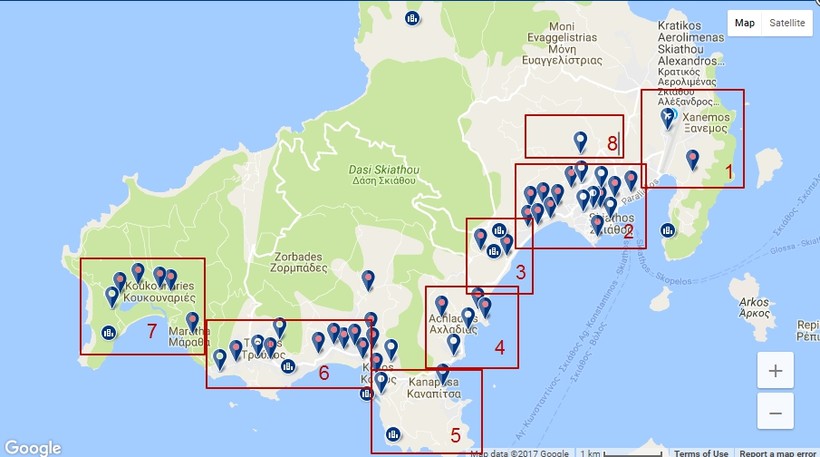 Аэропорт находится практически в городе. Ближайшие к аэропорту отели находятся либо в самом городе, либо в районе пляжа Ксанемос (зона №1 на карте). В районе упомянутого пляжа отелей совсем немного. Букинг показывает один-два отеля, по факту их там не больше пяти. В основном это также небольшие виллы и апарт-отели. Дорога туда от города не очень хорошая. Что касается дорог на Скиатосе, стоит учесть весь остров — это, по сути, большая деревня. Дороги в основном вполне соответствуют сельским. Если исключить главную дорогу, которая идет вдоль южного побережья, асфальт встречается крайне редко. Но ведь это не помеха хорошему отдыху, правда?