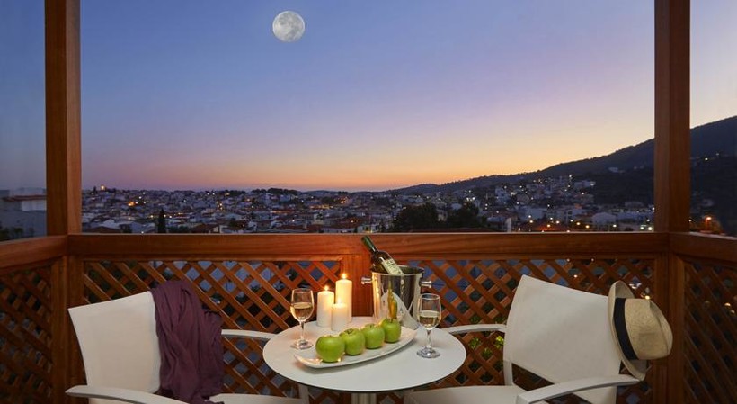 Выше я уже говорила, что на острове всего два отеля пять звезд: Kassandra и Skiathos Princess. Первый расположен примерно в четырех километрах от города на пляже Василиас, второй — в восьми километрах, на пляже Святой Параскевы. Цены в этих отелях начинаются от 200 EUR. Большинство номеров имеют свой балкон или солнечную террасу, а некоторые также и private pool. Здесь же можно упомянуть отель Atrium, который хоть и имеет всего 4 звезды, однако по уровню большая часть номеров (категории люкс, делюкс и т.д. — там еще порядка 12 различных категорий) не уступают пятизвездочным отелям. У него нет своего выхода на пляж, но благодаря своему расположению на возвышенности — из всех номеров открывается роскошный вид на море.