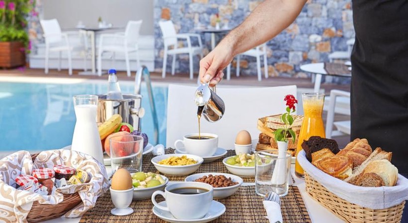 Отели средней ценовой категории, как я говорила в самом начале статьи, очень неоднородные. Есть хорошие, достойные, может быть, даже и большего, а есть явно переоцененные — здесь очень рекомендую читать отзывы и смотреть фотографии. Достаточно часто встречается потрепанная мебель, а в мае–июне еще и сырость. Однако персонал в основном приветливый и доброжелательный. Кормят в основном вкусно, но не круглосуточно. Я уже упоминала четырехзвездочные отели Esperides и Skiathos Palace — это одни из немногих отелей, где вам предложат завтраки, обеды и ужины в виде шведского стола, причем весьма разнообразные. В других отелях на Скиатосе не практикуют полный пансион, чаще всего только завтраки, либо завтраки и ужины а-ля карт.