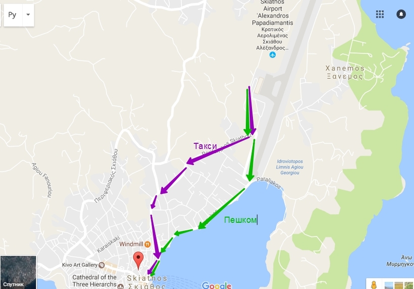 - Вы летите до Скиатоса самолетами со всеми необходимыми пересадками. Из аэропорта Скиатоса вы пешком (20 минут) или на такси (7-10 минут и 10-12 EUR) добираетесь до порта. Карту прилагаю. От порта начинается центральная улица города Пападиманти (Papadiamanti Street), в самом начале этой улицы (обе стрелки на карте ниже как раз на нее указывают) есть офис по продаже билетов на паромы. От Скиатоса на Скопелос есть паромы за 18 EUR (те самые Hellenic Seaways, которые вышли из порта Волос) или на местный Aqua Maria за 8,6 EUR.