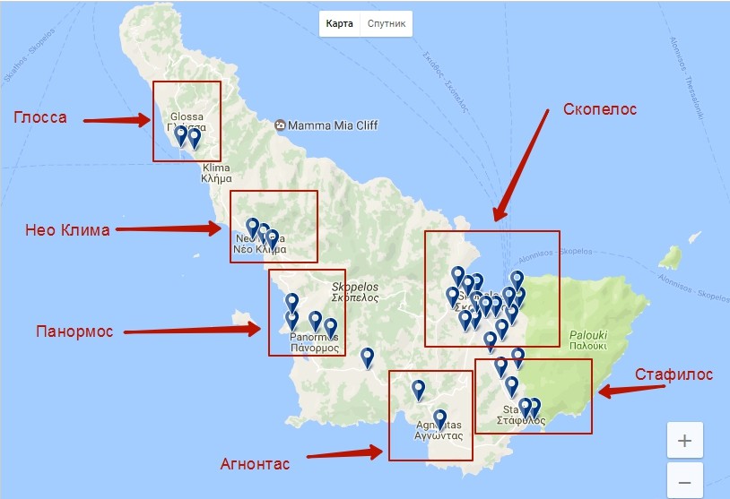 На карте видно, что отели есть во всех частях острова, но по факту 80% всех отелей и вилл находятся в самом городе Скопелос, его окрестностях и на пляже Стафилос. Можно сказать, что здесь сосредоточена вся жизнь острова. От города до пляжа всего 4 километра. Вследствие этого Стафилос — самый загруженный пляж острова.
