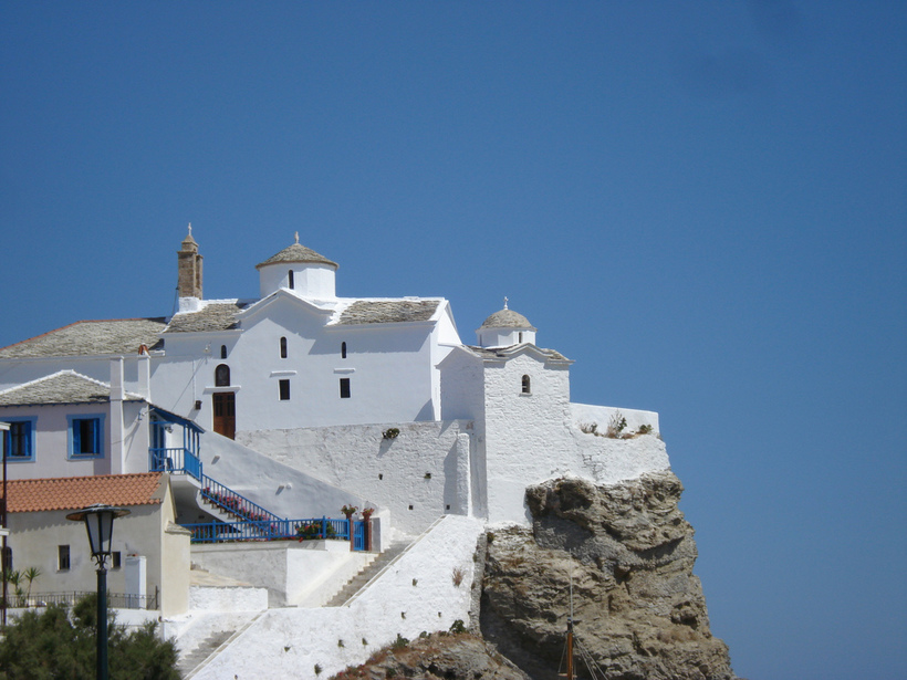 - Хора (Chora). Старый город на Скопелосе, как и везде в Греции, традиционно называется Хора. Эта часть города полностью пешеходная. Она сохранилась такой, какой строилась несколько сотен лет назад, когда на город еще постоянно совершали набеги пираты. Есть легенда, что город специально строился лабиринтом со множеством тупиков, чтобы запутать преследователей и быстро добраться до укрытия. А еще, поскольку город поднимается от моря вверх, то по ступеням лили оливковое масло и бегать по таким улицам становилось невозможно. Сегодня на самом верху вы найдете остатки старой Венецианской крепости. Город по-прежнему жилой, и здесь можно снять апартаменты.