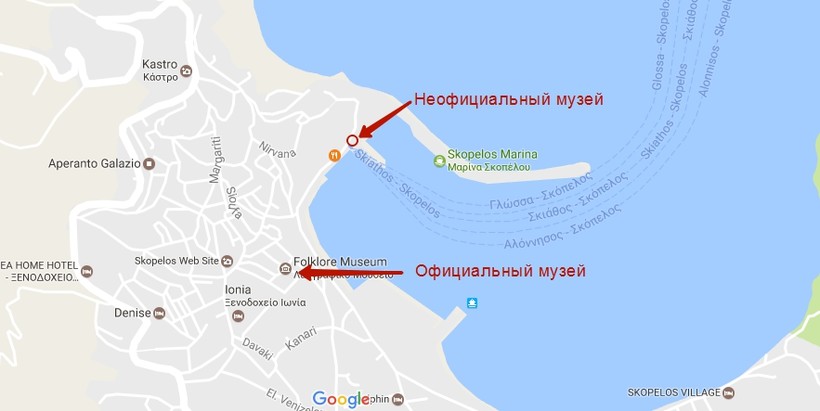 Пожалуй, стоит посетить хотя бы один музей истории острова. Они называются Folk Museums. Я знаю таких три, но, возможно, их больше, так как местные жители любят свой остров и гордятся его историей, так что иногда они сами собирают небольшие музеи, где в качестве экспонатов можно увидеть традиционную одежду жителей Скопелоса (и это не удивительно, вплоть до 70-х годов XX века эта одежда была такой же, как в XIX веке, и только в конце XX века сюда проникли современные веяния). Здесь же вы найдете предметы быта, элементы керамики, инструменты, фотографии. Вход в такие музеи обычно бесплатный или 2-4 EUR. Время работы, правда, не фиксировано. Официальный музей работает 2-3 часа в первой половине дня и столько же после четырех часов по полудни. Неофициальный работает во время работы ресторана, над которым он расположен. Прилагаю карту музеев. Третий подобный музей находится в городе Глосса.