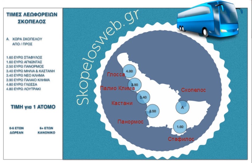 На острове только один автобусный маршрут от порта Скопелос до города Глосса. На своем пути автобус проходит через все основные пляжи и совершает 37 остановок. Стоимость проезда от 1.60 до 4.80 EUR. Максимальное время в пути (от первой до последней точки) — примерно час, может, чуть больше. На картинке отмечены зоны смены тарифа на проезд и основные остановки. Автобусом вообще пользоваться очень удобно. Стоит недорого и позволяет попасть почти в любую точку острова, ну кроме гор, конечно, куда можно забраться только пешком. Единственный минус — автобусы не идут на Агиос Иоанис.
