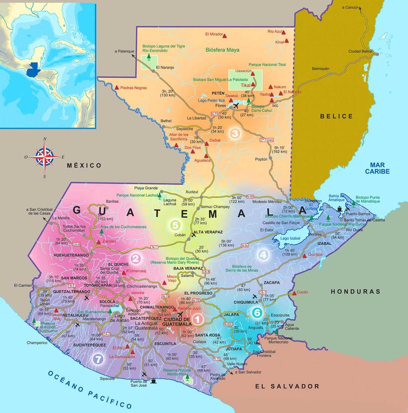 Все путешественники, прилетающие в Гватемалу на самолете, прибывают в центральный регион страны (на карте обозначен цифрой 1) и зачастую задерживаются там. Ведь именно здесь находится древняя столица страны Антигуа, окруженная тремя мощнейшими вулканами.