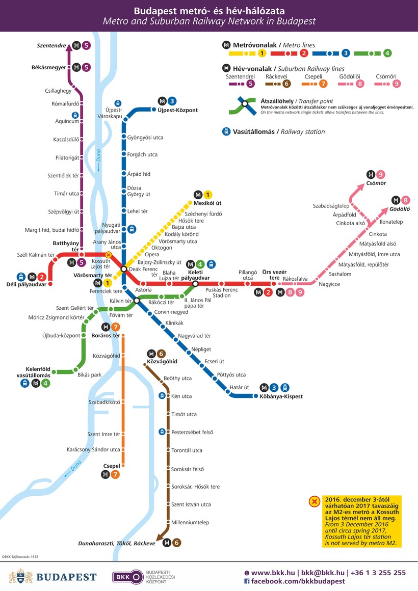 Метро в Будапеште состоит из четырех линий — жёлтой (М1), красной (М2), синей (М3) и зелёной (М4). Есть подземные и наземные станции. Совокупное количество станций — 52.
