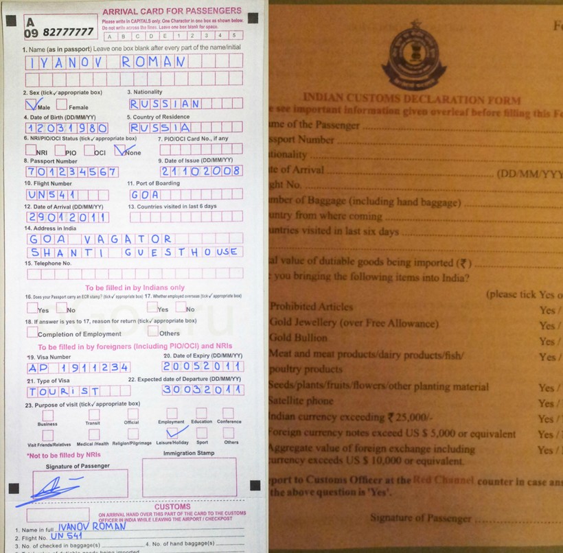Еще в самолете заботливые бортпроводники выдадут всем пассажирам Arrival cards и Declaration Form (миграционный бланк и декларацию ценностей). Очень советую заполнить оба прямо в кресле и не тратить на это время в аэропорту. Карточка прилета очень простая, к тому же в этом году ее размер сократили. Необходимо указать свои данные, номер рейса, адрес в Индии (напишите название своего отеля или гестхауса, если ничего этого нет – любое название), номер визы. В бланке для декларации помимо общих данных придется записать все ценные вещи, которые вы провозите в Индии. «Ценностями» считаются: запрещенные препараты, золото, мясо, рыба, молочные продукты, ядовитые вещества, семена и растения, спутниковые телефоны, наличность больше 25 тысяч рупий, валюта больше 5 тысяч долларов, совокупная сумма всех валют свыше 10 тысяч долларов. Если у вас с собой есть хотя бы один из перечисленных пунктов, придется проходить «красный коридор» таможни (зону таможенного контроля, в которую попадают пассажиры с багажом, подлежащим декларированию).