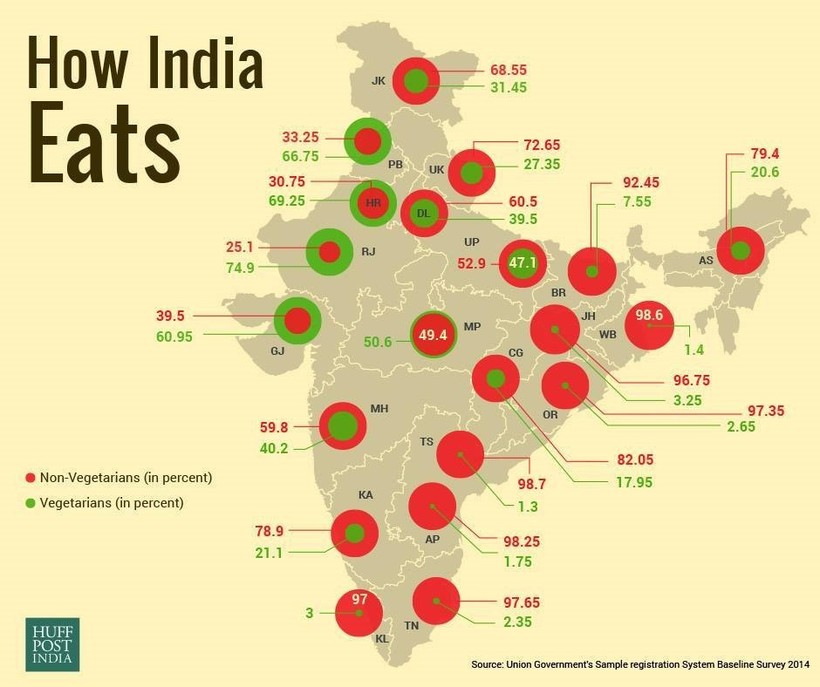 Индийская кухня в большинстве своем вегетарианская и очень острая. Рыбу и морепродукты в изобилии можно найти только на крупных морских курортах (Гоа, Керала). Все рестораны делятся на вегетарианские и невегетарианские. В больших городах можно найти и те, и другие. Но даже закоренелые мясоеды не страдают в Индии на овощах и фруктах. В такую жару намного легче обходиться без мяса, чем в России. К тому же индийская вегетарианская кухня настолько разнообразна и богата, что скучать по котлетам не приходится.