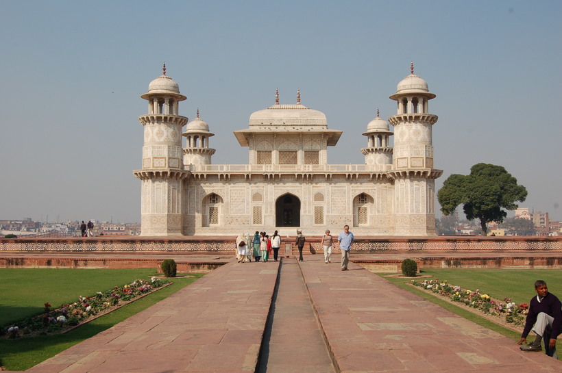 Бейби Тадж (Усыпальница Итемад-уд–Даулы). После форта я без раздумий отправилась в Усыпальницу Итемад-уд–Даулы. Еще называют в Агре Малым Тадж-Махалом, или Бейби Тадж. Внешним видом она действительно очень похожа на Тадж-Махал, только сильно уменьшена в размерах. Зато усыпальница находится посреди огромного сада, в котором обитают ручные бурундуки (в Азии их называют древесными белками), множество разноцветных птиц, названия которых я, к сожалению, не знаю.Кстати, не могу не упомянуть тот шокирующий контраст, который каждый раз возникает перед глазами, когда после жутко пыльных, вонючих улиц, полностью заваленных мусором и вдоль которых течет канализация, ты попадаешь в эти прекрасные зеленые сады. Если будете ехать с южной части города и пересекать реку Джамна, обязательно обратите внимание, как на ее берегах женщины полощут ткани, окрашенные в яркие цвета. Это и есть традиционный способ производства окрашенных тканей, который потом идут на пошив сари и других предметов текстиля.