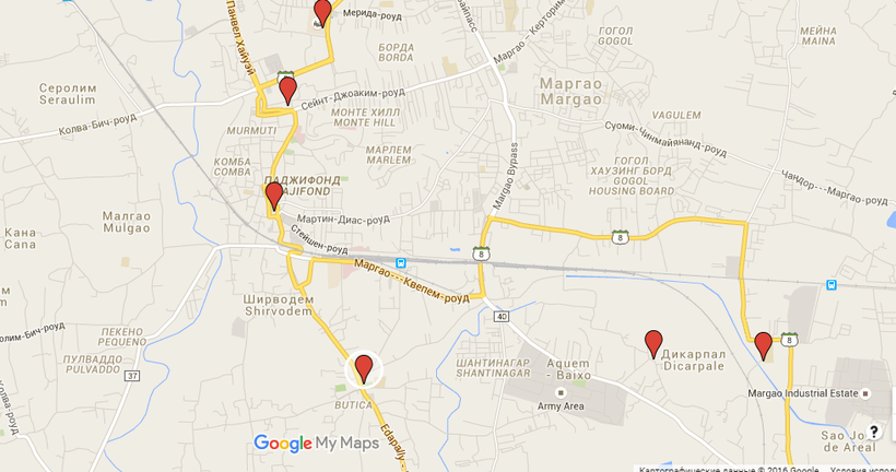 Если же вам хочется культурной программы, направляйтесь в Маргао. Там много старинных церквушек (отмечены на карте), которые отлично сохранились до наших дней, несмотря на то, что они были построены еще португальцами несколько веков назад.