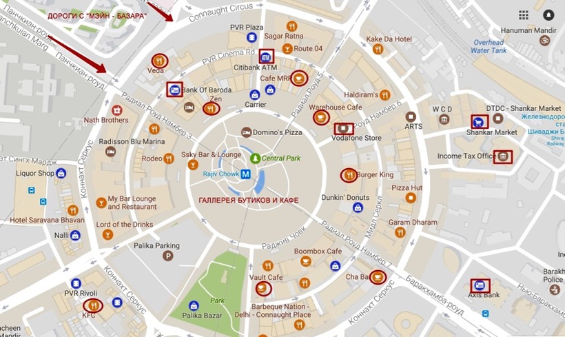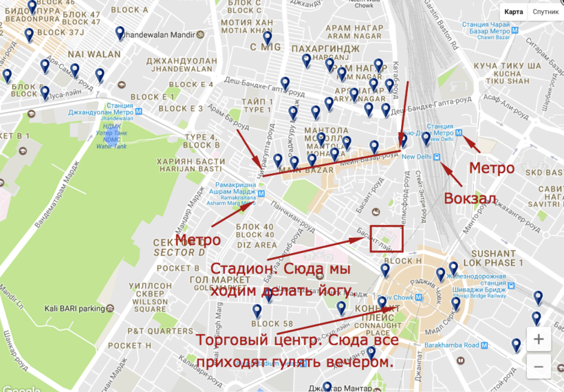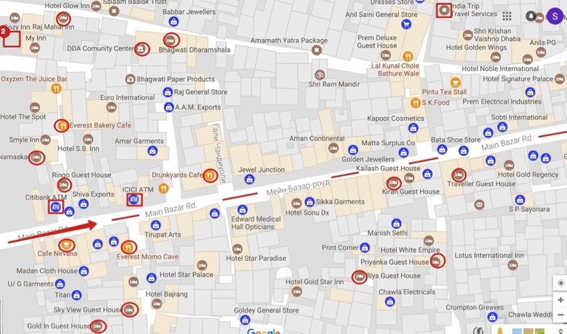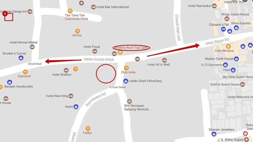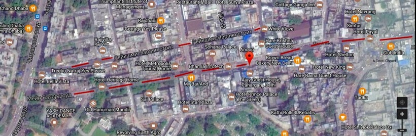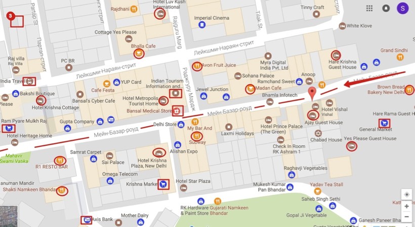 Мэйн-Базар — это основная большая торговая улица, которая находится в районе Pahar Ganj (Пахар-Ганж). На карте я обозначила ее начало и конец двумя стрелками.