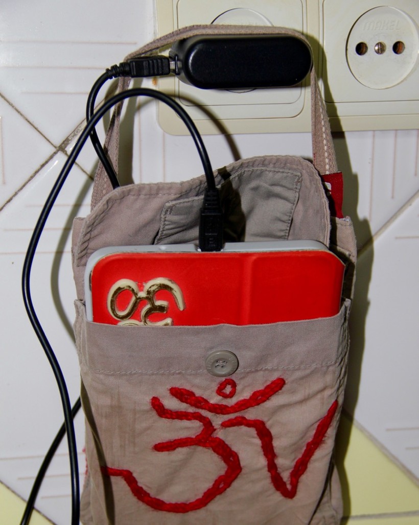 И вот, напоследок: наше весьма полезное изобретение — карман для зарядки мобильника. Один наш друг очень любит носить штаны со множеством карманов, и когда он их снашивает, мы их не выбрасываем. Мы делаем вот такие штуки!