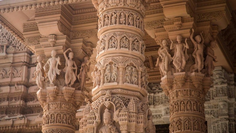 Мандир (храм по-индуистски) стоит на 234 столбах, украшенных тончайшей ручной резьбой. У него 9 огромных куполов и 20 шпилей. Всего около 20 тысяч статуй различных духовных последователей индуизма. На стенах снаружи храма барельефы и горельефы со сценами из притчей и святых писаний. На куполах, сводах, и столбах — истории о святых, о преданности учению Нараяны, жизнеописания Нилкантха.