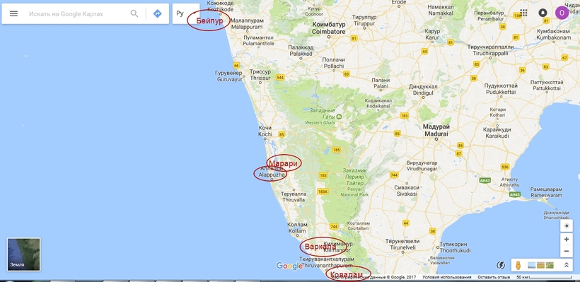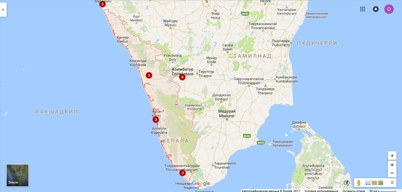 Итак, в Керале расположено три международных аэропорта в городах (см. карту, номера 1–3):