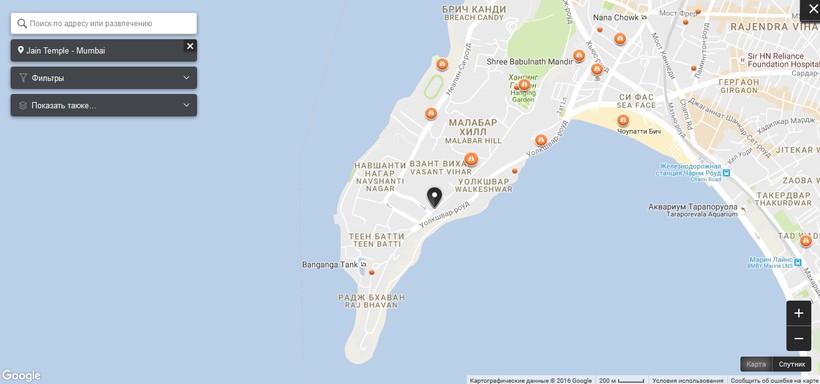 - Храм Джайнов. Расположен на Малабарском холме недалеко от улицы Уолкшвар роад. Джайнизм является национальной религией Индией. Храмы джайнов отличаются своей роскошью и простотой одновременно. В оформлении используется золото и серебро, при этом все очень сдержанно. Храмы джайнов знамениты своей ажурной мраморной отделкой, стены украшены тончайшим кружевом, выполненным из камня. Джайнизм проповедует полное ненасилие, поэтому есть некоторые правила посещения храмов. Вас не пустят внутрь, если при вас есть кожаные вещи (ремень, кошелек, туфли и т.д.), обувь нужно снимать перед входом, женщины в период критических дней также не допускаются.