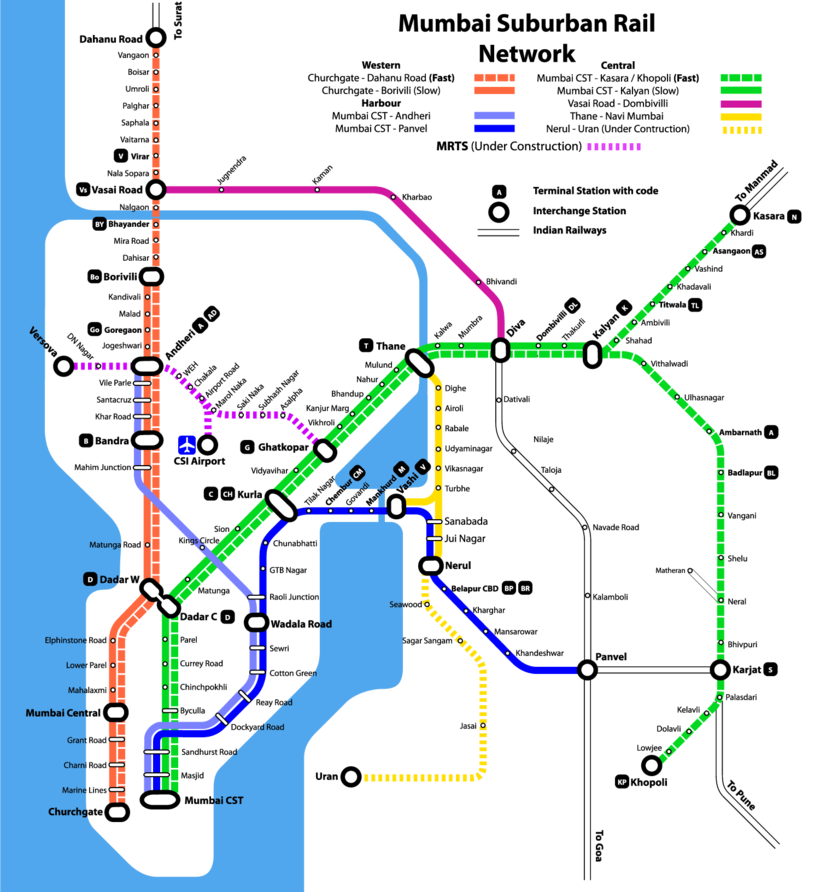 - Западная линия идет вдоль всего побережья на западе и состоит из 36 станций (Dahanu Road – Churhgate), причем она состоит их двух параллельных железных дорог – обычной и экспресс. На обычной линии поезда останавливаются на каждой станции, на экспресс – только на самых главных.