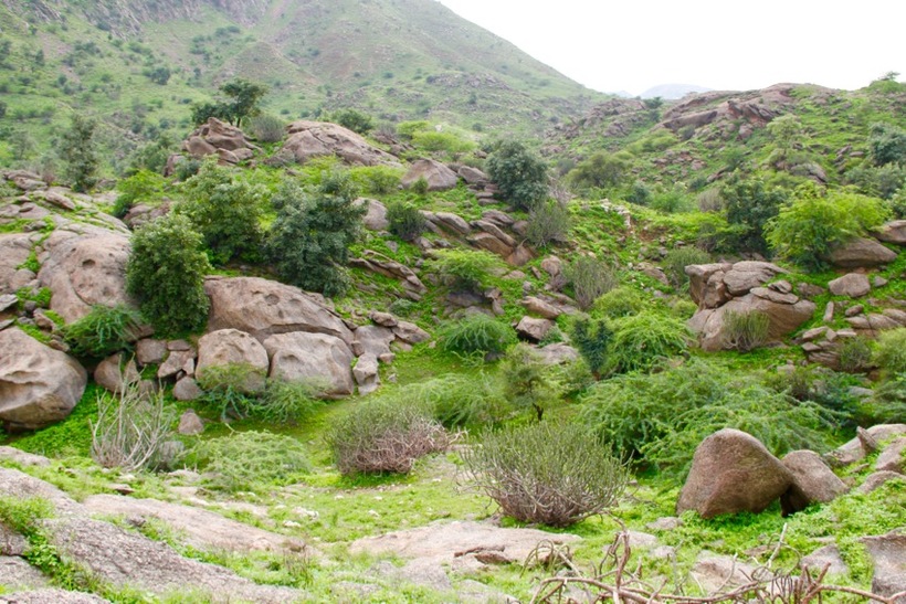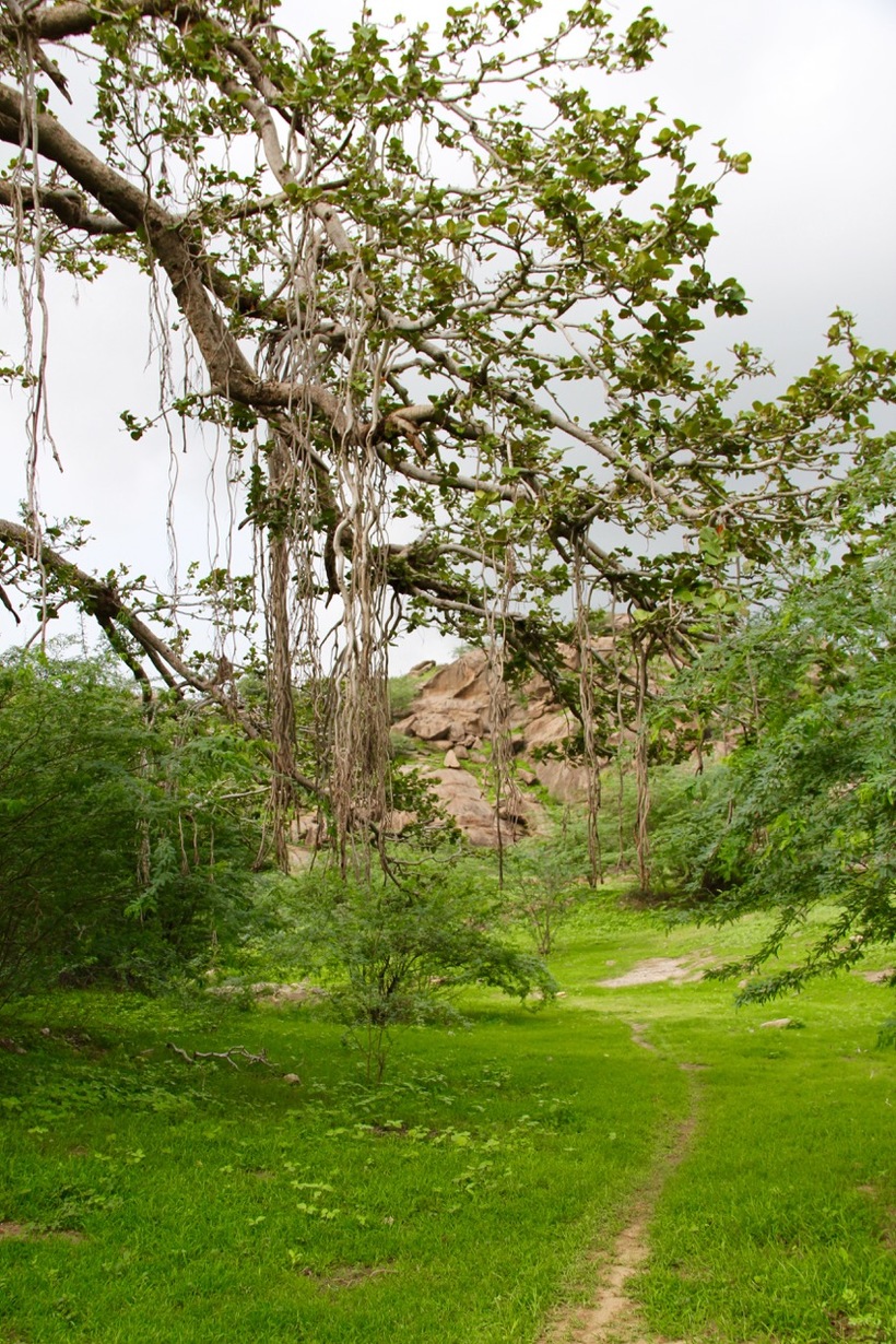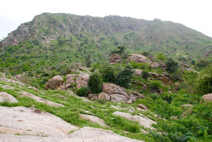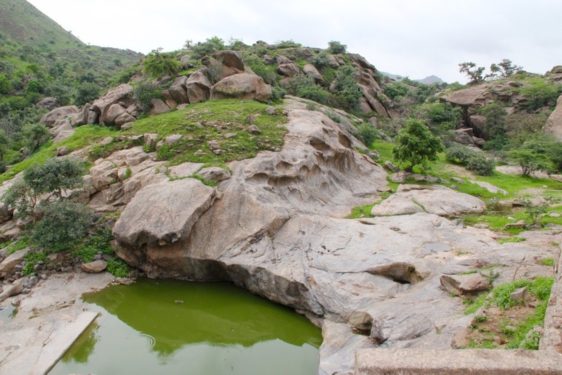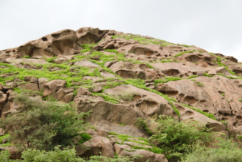 Дорога к Аджъяпалу живописная, вымощенная камнями и проложена между зелеными холмами вперемешку с огромными камнями оплавленной формы, местами напоминающими лунный ландшафт.