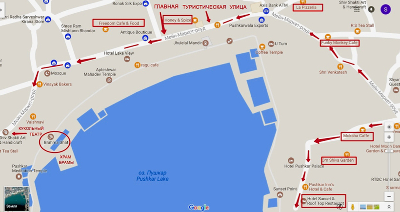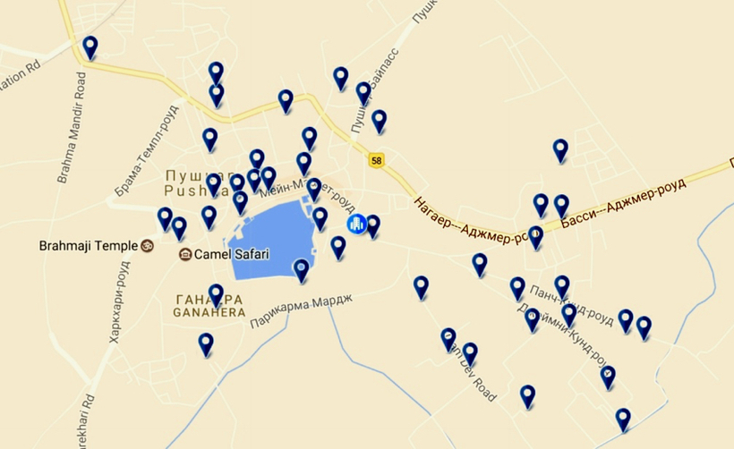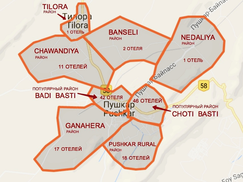 Несмотря на то что Пушкар маленький город, отелей и гестхаусов в нем предостаточно. Ориентироваться в городе легко, практически все храмы и ашрамы выстроились по перимеру всего озера вдоль гхатов для омовения (ступени на берегу озера, уходящие прямо в воду). Все самые популярные и удобные по расположению отели располагаются также вокруг озера. Вот все районы города для удобства ориентации для поиска подходящего отеля.
