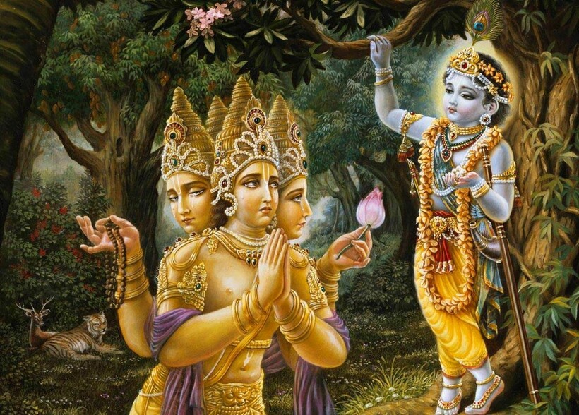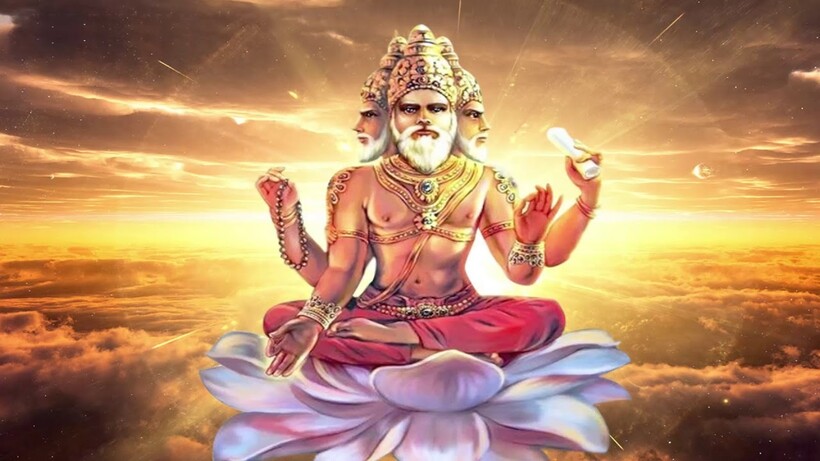 Веды гласят, что в начале времен был хаос, похожий на большой океан с тихими водами. Вода породила огонь, от тепла появилось золотое яйцо — колыбель верховного бога Брахмы. Яйцо раскололось пополам — одна его часть стала небом, другая — землей. Чтобы не быть в одиночестве, Брахма создал себе сыновей и дочерей, по разным источникам их от 10 до 20. Эти боги стали отцами и матерями тысячам других богов, которым сейчас покланяются индуисты:
