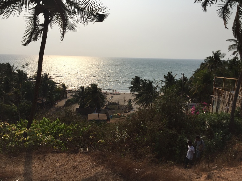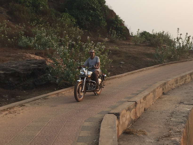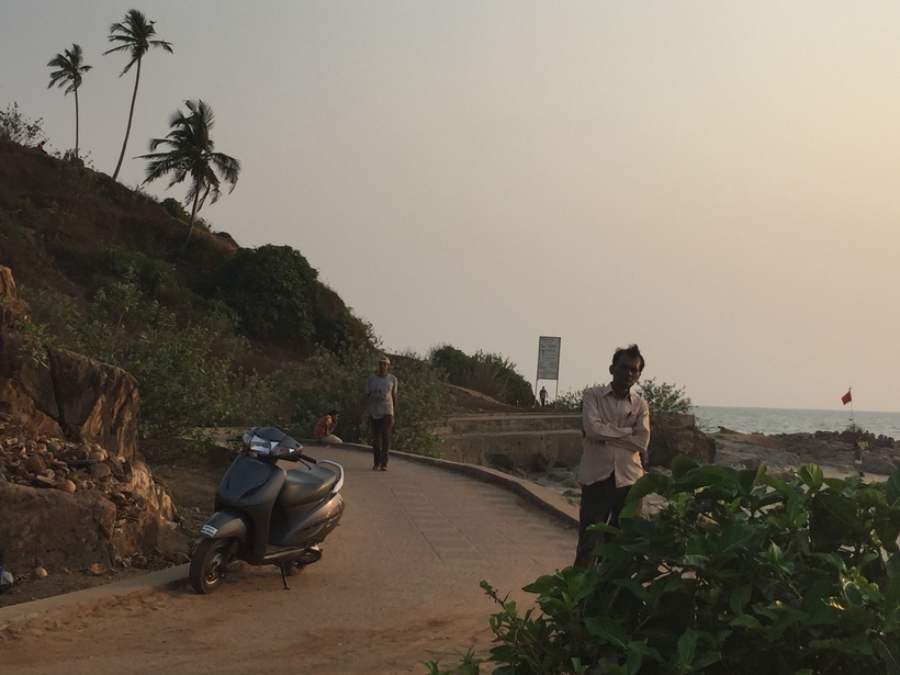 Далее к пляжу ведет тропинка, петляющая между пальмами. Некоторые отважные индийские байкеры (чаще всего местные жители), спускаются на пляж Смол Вагатор на своих двухколёсных конях. Я против этого по двум причинам. Во-первых, прибрежная полоса – не место для катания, спуск здесь каменистый и авария может произойти вне зависимости от опыта вождения байком. Во-вторых, ваша лихая поездка до пляжа «с ветерком» стесняет пешеходов и даже в какой-то степени угрожает им.