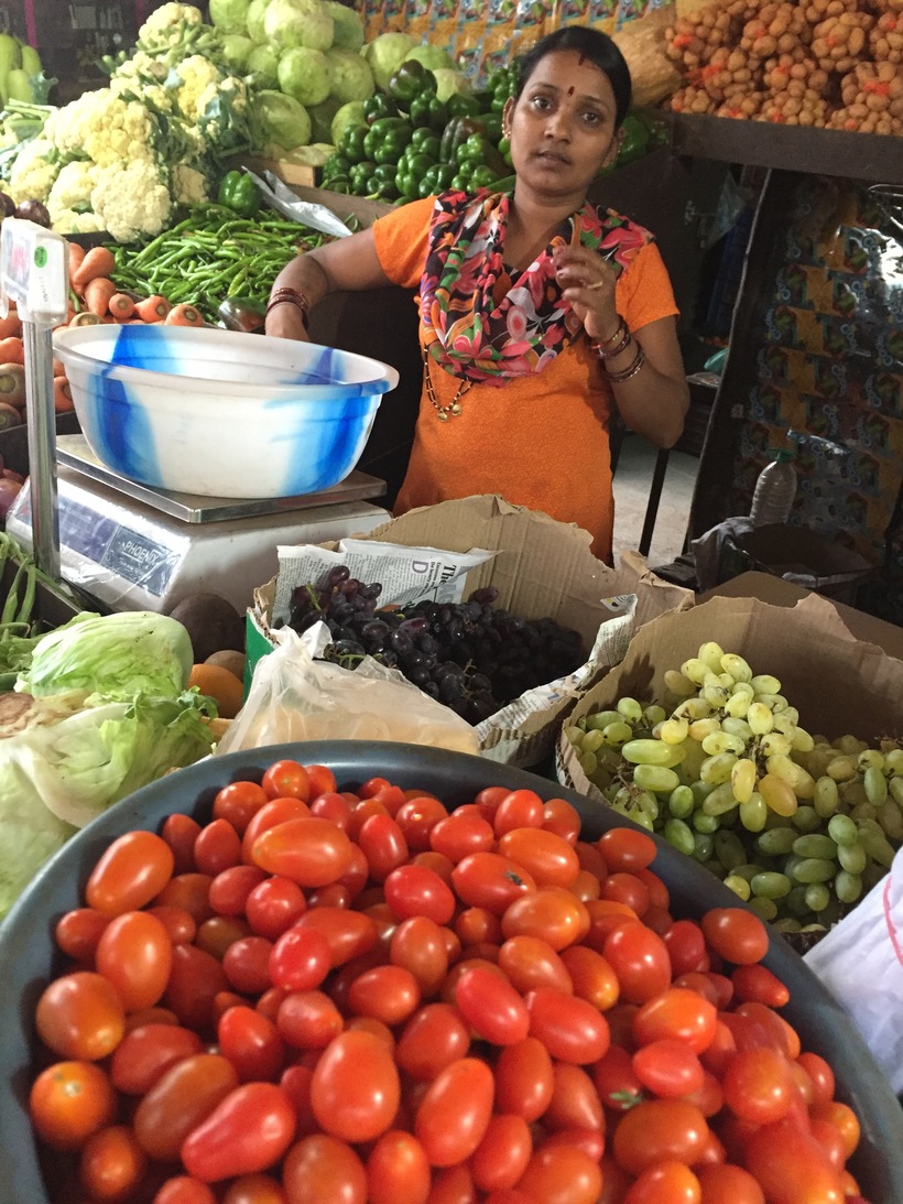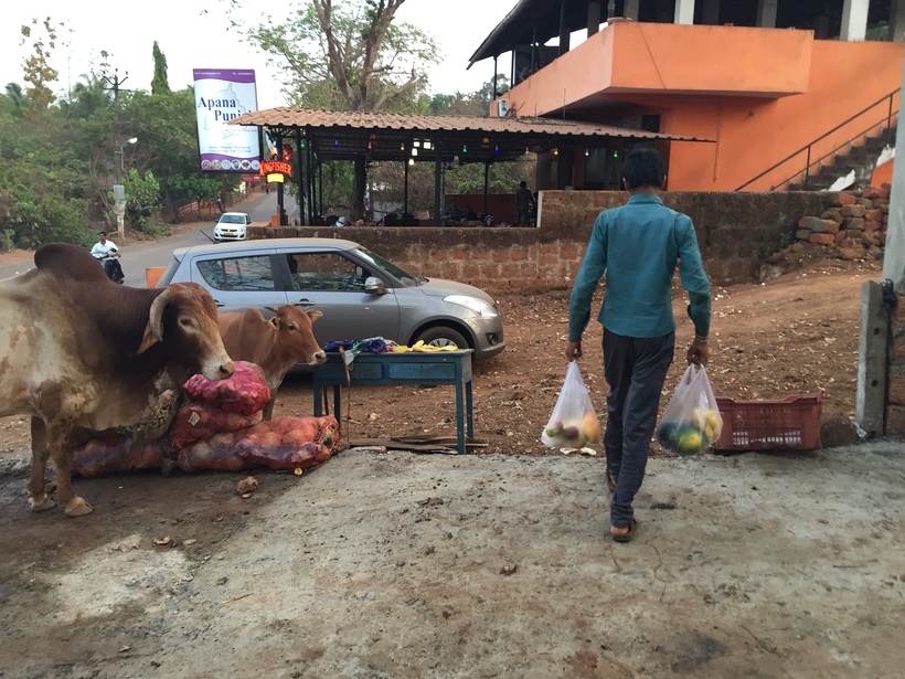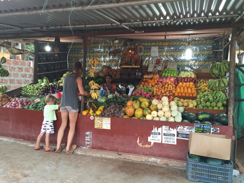 Хозяин овощной палатки приехал в Гоа десять лет назад из штата Карнатака. Торгует витаминами его жена и многочисленные ловкие ребята – помощники. Они и лучший арбуз выберут, и тяжеленные мешки с покупками донесут до машины или байка.