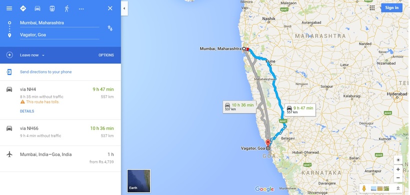 Поездка на авто в Гоа из других городов Индии запомнится надолго даже закостенелому российскому дальнобойщику. Вам предстоит экстремальное вождение без правил по бездорожью. Коровы и пешеходы будут выскакивать под колеса в самых неожиданных местах. Кроме того, встречные машины тясячи раз ослепят фарами дальнего света. В Индии просто не принято переключать их на ближний. Расстояние от Мубайя до Вагатора по трассе NH4 составляет 557 километров, среднее время в пути — 10 часов.