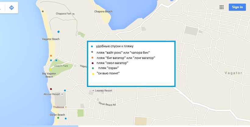 Есть несколько централизованных спусков к берегу Аравийского моря. Я обозначила каждый удобный подход к пляжам на карте точками разного цвета.