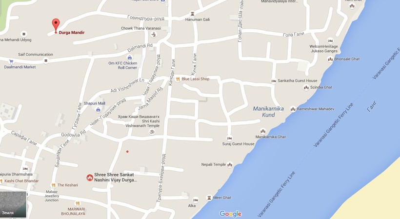 Храм богини Дурги (Durga Mandir) расположен в глубине города, если идти от реки, но до него можно прогуляться пешком (чуть более 1 км). Из других точек города легко добраться на такси или авторикше (3–4 $). Дурга Мандир расположен в 2 км от университета (Banaras Hindu University).