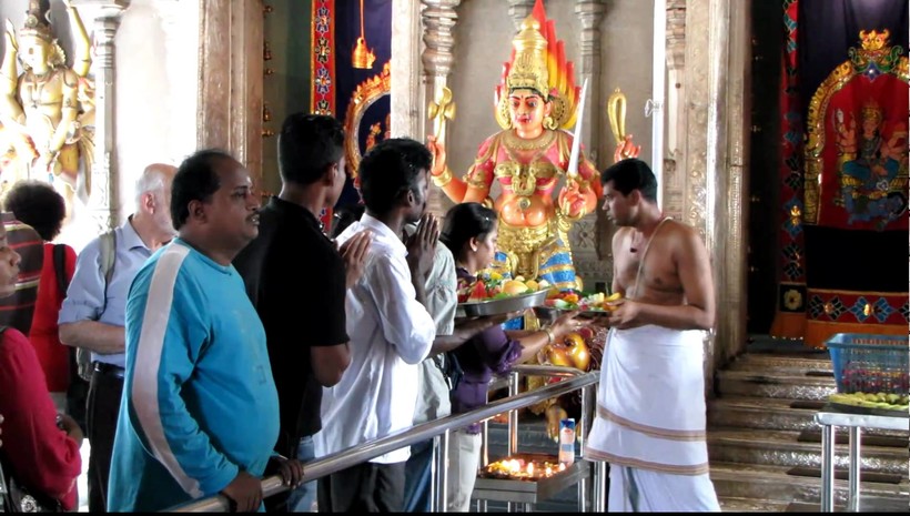 - Что касается самих обрядов, их очень много. Расскажу общие вещи, с которыми мне приходилось сталкиваться чаще всего. Возле индуистского храма продаются подношения богам: корзинки с фруктами, гирлянды из жасминовых бутонов, ароматические палочки. Покупать или нет – дело ваше (стоимость от 0,15 до 1,5 $ (10 до 100 рупий). Внутри храма перед алтарем придется выстоять очередь. Если вы взяли подношение, передавайте его брамину только правой рукой. Он отнесет дары божеству и вернет их вам. Освященные фрукты и цветы индусы забирают домой. Вы можете угостить кого-нибудь, но ни в коем случае не выбрасывайте их. Также брамин может поставить красным порошком вам тилаку на лоб. После вам подадут ложечку воды, поднесите правую ладонь для нее, выпейте, а остатками проведите по голове.