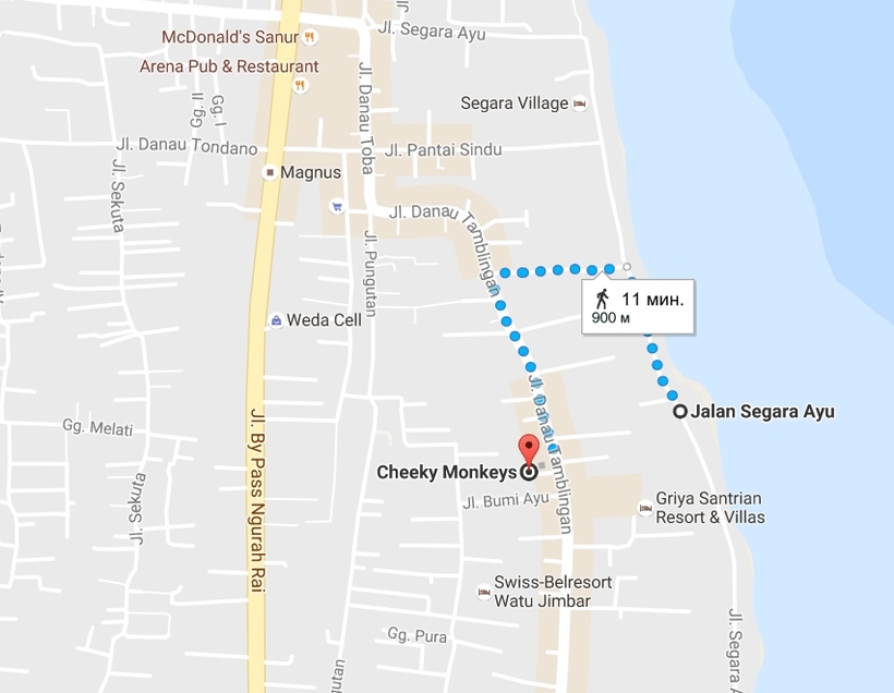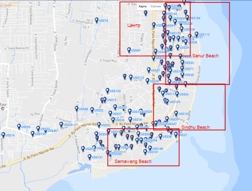 Первую береговую линию в Сануре занимают отели и гестхаусы, в городе местные балийцы сдают комнаты, чуть поодаль от главных улиц — Jalan Tamblingan и Jalan By Pass Ngurah Rai — комплексы вилл. На карте ниже представлена мизерная часть имеющихся вариантов.