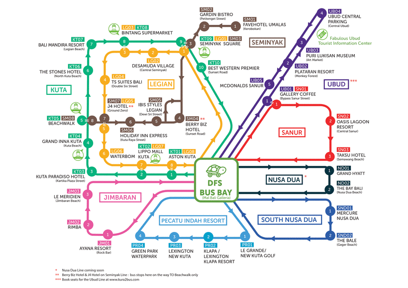 - Kura-KuraЯпонская автобусная компания, связывающая самые главные города Бали. На комфортабельных зеленых автобусах с кондиционером и даже Wi-Fi вы доберетесь до Санура за 2,3 USD (30 000 IDR).