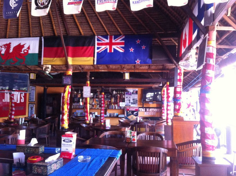 Из минусов (не для всех) — в заведении разрешено курить, и к закрытию запах может мешать некурящим. Адрес: Jalan Danau Tamblingan 120, Sanur Tel: +62 (0)361 287 263. Время работы: 10:00–00:00. - Lazer Sports Bar Когда мне захотелось продолжить ужин музыкой и танцами, мне посоветовали его. Действительно, при неплохой еде здесь имеется отличная живая музыка и танцевальные программы. Можно приходить компанией, а можно знакомиться на месте: после коктейлей от бармена для этого есть и настроение, и возможность. Можно заказать любимую песню, озвучить поздравление. По субботам здесь на сцене танцуют профессионалы (не только стрип). В дни спортивных трансляций на экранах идут показы, все-таки это спорт-бар. Достойный выбор пива и закусок. Адрес: Jalan Danau Tamblingan No. 82, Sanur. Время работы: 10:00–02:00.