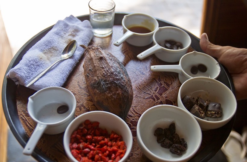 - горький шоколад с 67 % какао и добавлением ягод годжи либо орехов — за 4 USD (50 000 IDR);