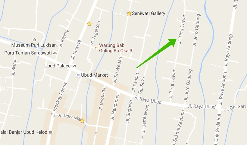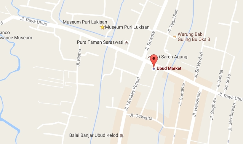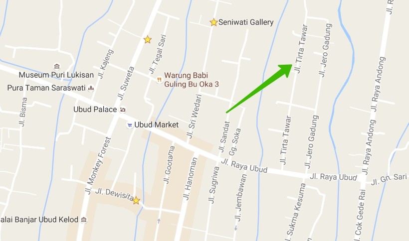 Находится в западной части города на улице Jl. Sukma No. 2, Tebesaya, Ubud.