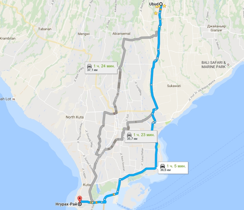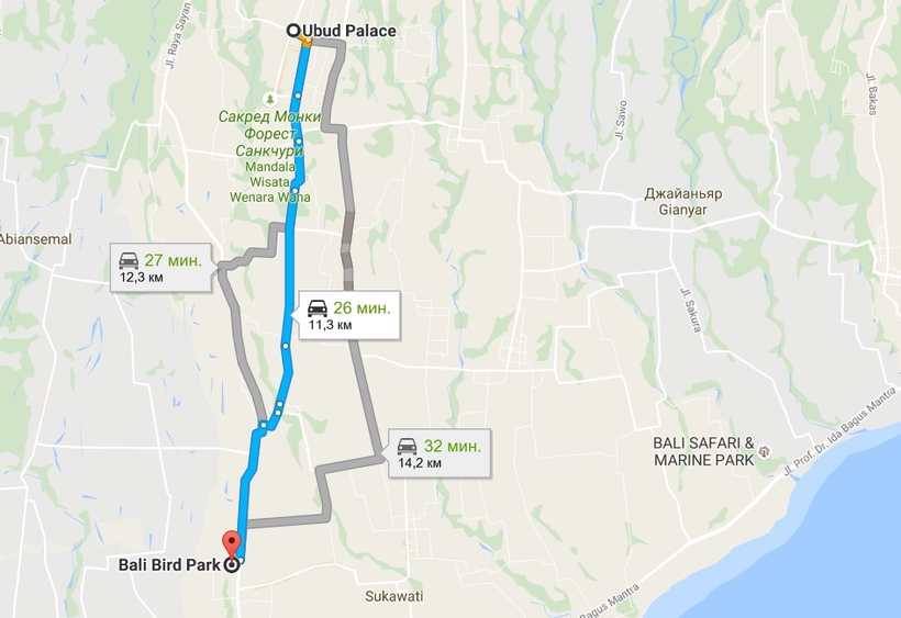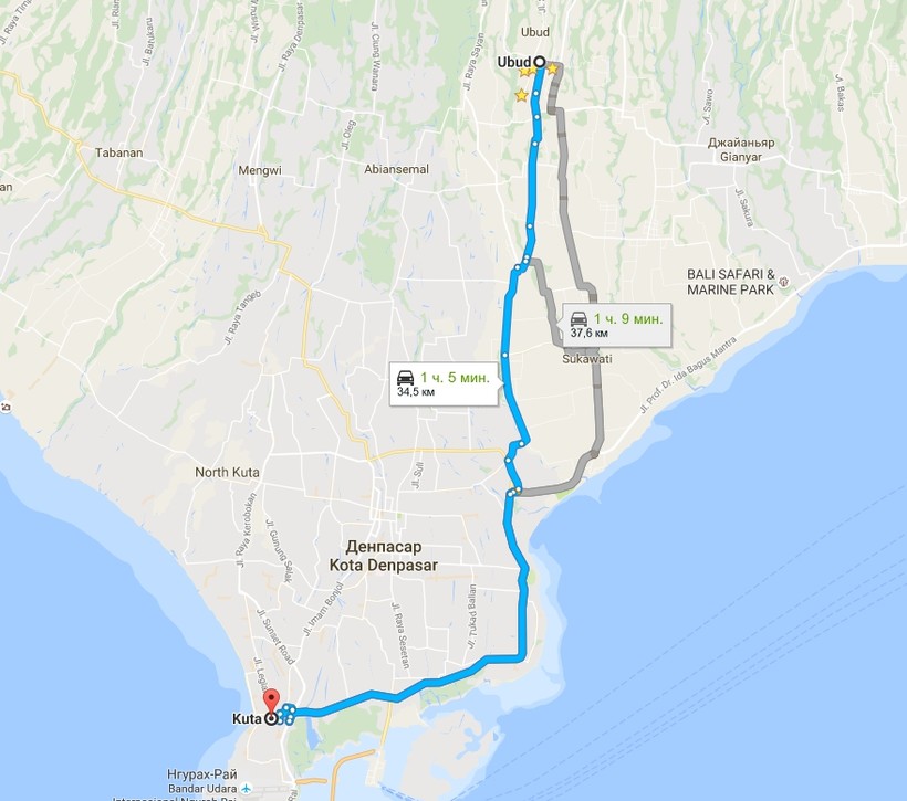 Убуд расположился в середине острова Бали, так что от популярных южных курортов (типа Куты) до него ехать 40 км (1,5 часа), а от главного аэропорта Денпасара – 27 км (1 час). Как же преодолеть этот путь?