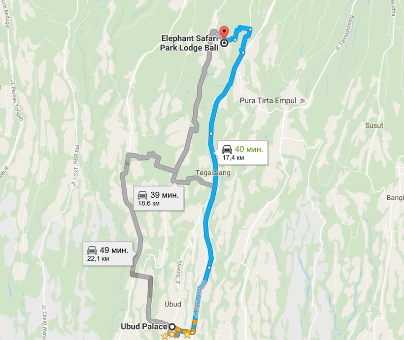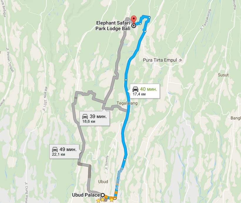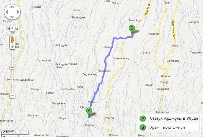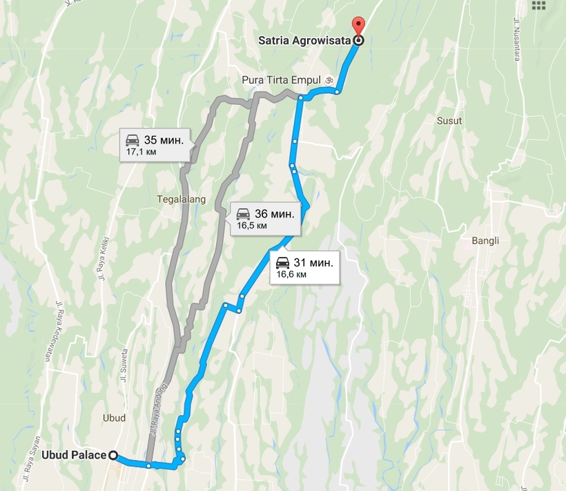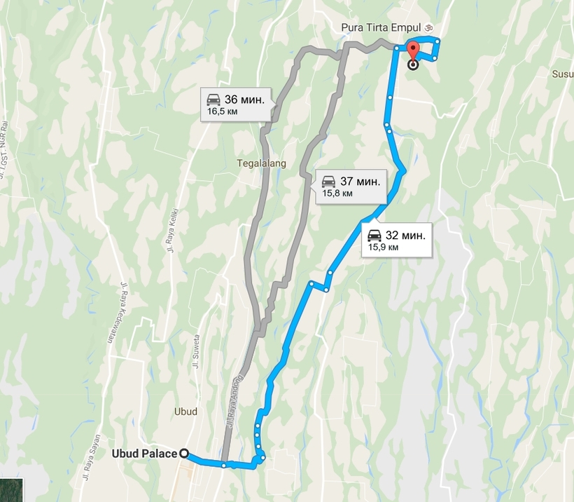 Автобус или маршрутка следует через Санур, потом заходит в Убуд, проезжает Monkey Forest и высаживает пассажиров на главной улице Raya Ubud. Есть остановка у музея Puri Lukisan, после чего автобус едет по улице улице Hanoman.