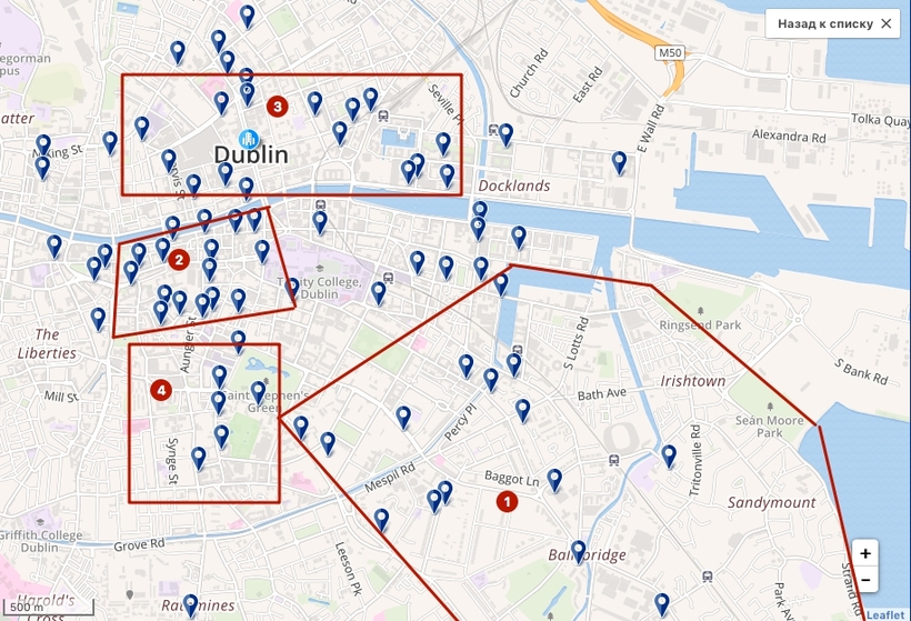 Самые популярные районы для проживания в Дублине это: Темпл-бар, Болссбридж, Сант-Стивен-Грин и Бродстон. Разумеется, цена за проживание будет зависеть не только от категории отеля и количества звезд, но и от местоположения и удаленности от центра в частности, так что стоит учесть, что проживание в районах Сант-Стивен-Грин (4 на карте) и Темпл-Бар (2 на карте) обойдется в значительно большую сумму, чем в других районах города.