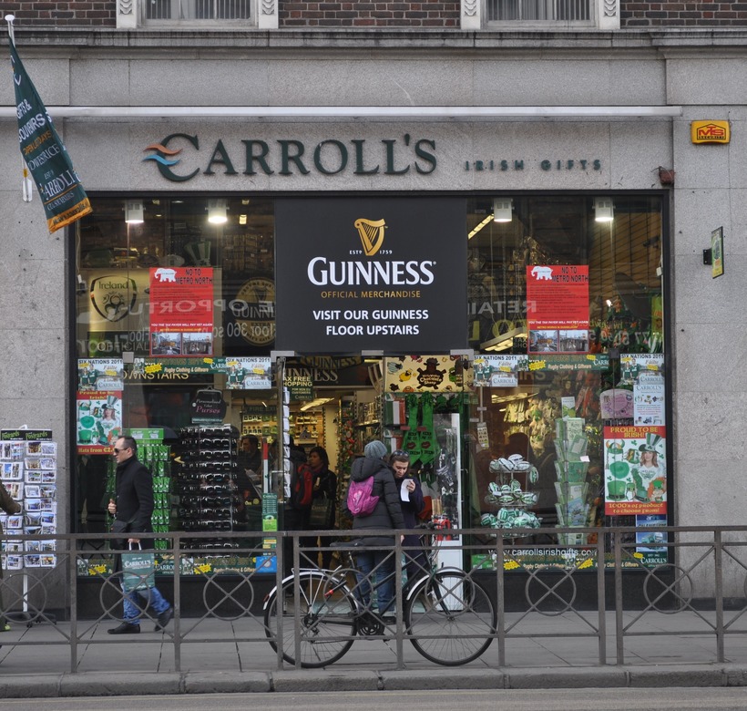 Несмотря на то, что различных сувенирных магазинов по всему городу огромное количество, ассортимент везде примерно одинаковый: предметы быта и декора с символикой пива Гиннес и виски Джеймсон, флаги и шарфы с национальным триколором, а также футболки и толстовки с забавной надписью о том, что их владелец побывал в Ирландии.